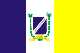 Vertical tricolour blue-white-yellow, with municipal arms centred on the white stripe.