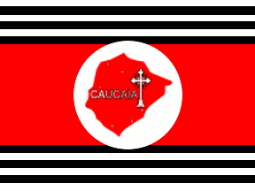 Horizontally divided 1:2:1, the top and bottom divisions further divided into 6 narrow white and black stripes, with the white stripes on the edges of the flag. Centred, and overlapping slightly the black stripes, a white disk bearing a map of the municipality in red, rotated so that north is toward the fly, and the name CAUCAIA in white and a white ornamented cross.