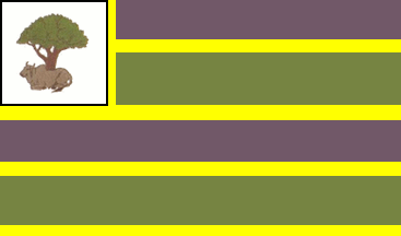 Four horizontal stripes alternating dark blue and dark green, separated by narrow yellow stripes; a white square canton as deep as the top two blue and green stripes, bordered yellow, with a zebu cow lying under a tree.