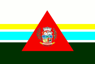 Irregularly horizontally striped white, yellow, light blue, dark green, overlain by a red equilateral triangle bearing the municipal arms.