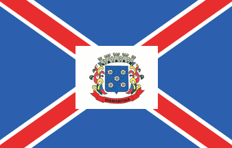 A red saltire fimbriated white on a blue field bearing the municipal arms on a white rectangle in the centre.