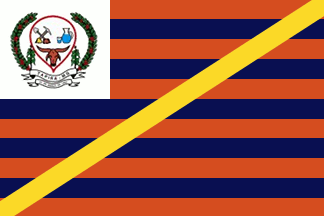Eleven alternating red and blue horizontal stripes, with a yellow ascending diagonal across them, and in the upper hoist, a white square 5 stripes deep with the municipal arms.