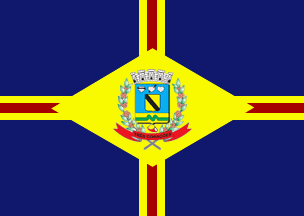 A dark blue flag, with a centred upright narrow red cross, fimbriated yellow, and yellow diamond bearing the municipal arms.