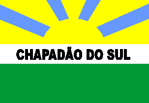 A yellow-white-green horizontal tricolor in ratios approximately 2:1:2 with four blue rectangles arranged as sun rays on the yellow stripe and CHAPADÃO DO SUL written in black on the white stripe.