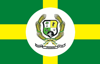 An centred yellow cross on a green field, bearing the municipal arms on a white disk.