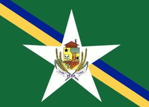 A green flag with a bicolored blue over yellow bend, over all a large white star bearing the municipal arms.