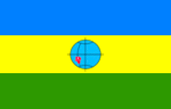 A horizontal blue-yellow-green tricolour with a blue globe in the centre, locating the municipality in white on a red map of Brazil.
