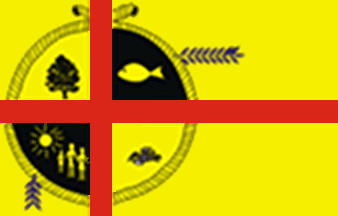A red off-centred cross on a yellow field, overlain on a black/yellow rendition of the municipal arms.