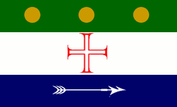 A green-white-blue horizontal tricolour, three gold disks on the green stripe, a red outlined white cross in the centre, and a white arrow with a double head on the blue stripe.