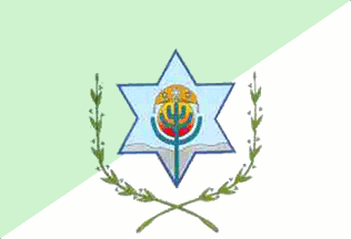 Divided light blue over white per bend sinister with the municipal arms centred.
