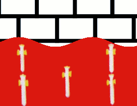 Horizontally divided, slightly less than 1:1 by a wavy line, above a bricked pattern of black lines on white, below a red field with five gold-hilted silver swords, pointing down, arranged 2-1-2 from hoist to fly.