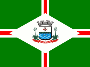 A red upright cross, bordered white, on a green field with the municipal logo centred on a white diamond.
