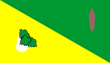 Divided per bend, green over yellow, with a green and white object on the yellow field, and a gold object on the green field.