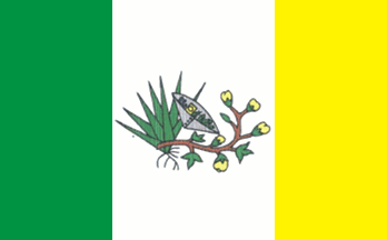 Vertically divided green-white-deep yellow, 2-3-2, with the municipal logo centred.