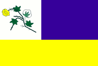Horizontally divided, approximately 3:2, with the upper stripe vertically divided, approximately 2:3, white and blue, all over yellow, with a sprig of cotton in the white square.