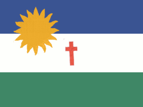 Horizontally triclor, blue-white-green, with a multi-rayed sun in the upper hoist, and a small red Latin cross centred in the white field.