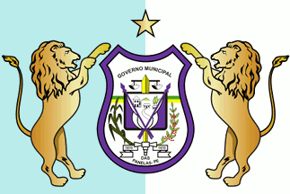 Vertically divided light blue and white, with the municipal arms centred, including lions as supporters.