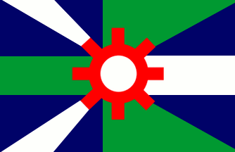 A modified gyronny flag, dark blue, green and white, with a central red cog wheel.