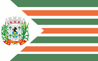 Horizontally divided green-white-red-white-green-white-red-white-green-white-red-white-green, white stripes narrower, with the municipal arms centred in a white triangle, extended from off the hoist.