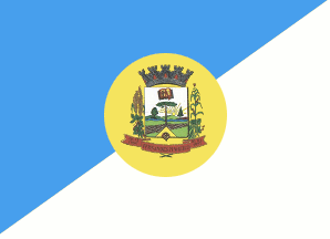 Divided per bend sinister, blue over white, with the municipal arms centred on a yellow disk.