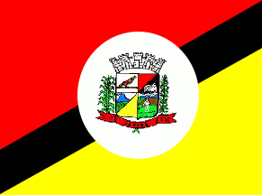 Diagonally divided per reduced bend sinister, red-black-yellow, with the municipal arms centred on a white disk.