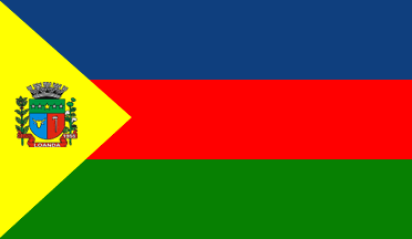 A blue-red-green tricolor with a yellow triangle extending from the hoist, bearing the municipal arms.