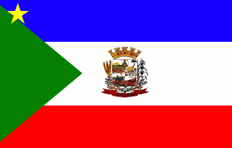 A blue-white-red tricolor with a green triangle extending from the hoist, the municipal arms centred and a small yellow star in the upper hoist.