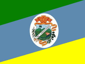 Diagonally divided per reduced bend sinister, green-blue-yellow, with the municipal arms centred on the blue field inside a white oval.