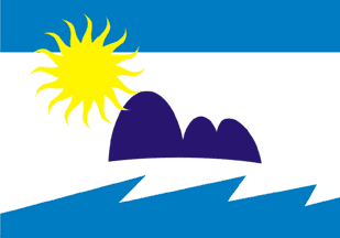 A white flag, the top fourth blue, the bottom fourth also blue, but with an irregular zigzag edge, in the centre three inselberg-shaped hills in dark blue and a multi-rayed yellow sun extending into the upper blue field.