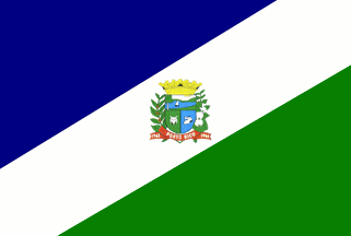 Triband per bend sinister, blue-white-green, the white stripe bearing the municipal arms.