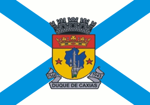 Article 2 - The coat of arms shall have the following form: Portuguese shield; Gold, on the geographic outline of the municipality in blue a depiction of the refinery of Duque de Caxias in silver standing on a green field; the main charge flanked by two red stars to the right and left; a chief gules (red) showing a gold ducal crown with its precious stones. In base, a silver scroll with the following inscription: "1566 - Duque de Caxias - 1943. The whole ensigned by a silver ducal [actually, mural--ed.] crown of five towers representative of the city.Dov Gutterman, translated Joseph McMillan, 18 November 2000Article 3 - The flag will be composed of two blue stripes on a white ground, crossing diagonally, having on the center the coat of arms of the municipality, recording its traditions and historical origins and development, the present and future of the municipality, in a serene struggle [!] for industrialization.