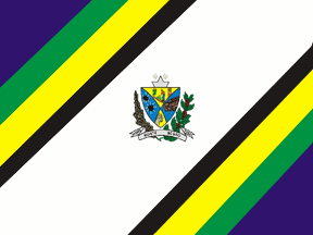 Striped per bend sinister dark blue-green-yellow-black-white-black-yellow-green-dark blue, the white stripe much wider, and the black stripes slightly narrower; in the centre the municipal arms.