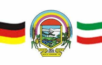 A white flag with the municipal arms in the centre and small waving German and Hungarian flags on either side.