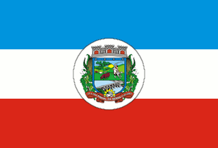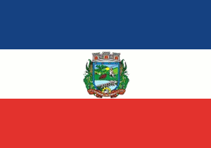 A blue-white-red horizontal tricolour with the municipal arms centred in a white disk extending on to the blue and red stripes.