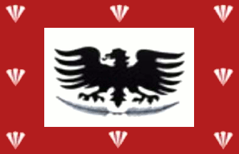 A white flag with a wide red border bearing 8 white scallops, and a black eagle in the white field.