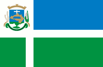 An off-centred upright on multicoloured field, white, blue and green, with the municipal arms in the white canton.