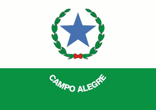Horizontally divided 2:1 white over green, with a large blue star centred on the white stripe, and encircled by a green wreath tied with a red bow, and in the green field the words CAMPO ALEGRE in white in an arc.