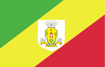 Diagonally divided on a rising diagonal, green-yellow-red, with the municipal arms on a white shield in the centre.
