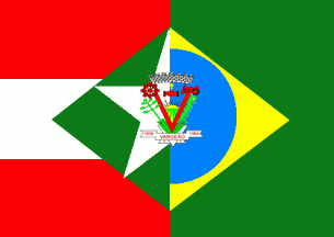 A dimidiated design, using the base of the state flag (horizontal triband red-white-red, green lozenge, white star) and the base of the national flag (green field, yellow lozenge, blue disk), with the municipal shield over all in the centre.