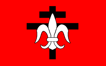 A red flag with a white fleur-de-lis superimposed on a black cross of Lorraine (in Portuguese, Lorena).