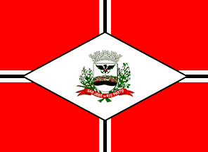 Our municipality created its flag by law in 1936. Its colors are the same as those of the flag of the State of São Paulo: red, black, and white. The flag of the municipality is formed by a red rectangle divided per cross by white and black stripes, upon which, in the center, is a white lozenge and within it the coat of arms of the city.Translated by Joseph McMillan, 9 July 2001Significance: