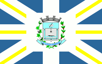 A blue field with a broad white upright cross and a broad white saltire, with narrow yellow stripes in the arms of the saltire and in the horizontal arms of the upright cross, all overlain by white square bearing the municipal arms.