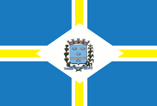 An upright yellow cross, bordered white, on a blue field with the municipal arms in the centre on a white diamond.