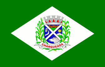 The coat of arms is "A classical Flemish Iberic shield surmounted by an eight-towered mural crown ports gules On a field azure, a saltire argent surrounded in chief by a factory or issuant form a terrace vert, dexter by a cocoon and a silkworm argent, sinister by a mountain argent nascent from a terrace vert and ensigned by a heraldic sun or, and in base by the head of a tapir argent issuant from sinister. The shield surrounded dexter by a sugar cane and sinister by a plant of maize the two proper, crossed per saltire below the shield and holding a scroll argent inscribed with the toponym 'CHARQUEADA' in letters gules."