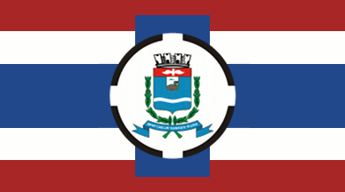 Five horizontal stripes, red-white-blue-white-red, ratio 1-1-2-1-1, with a vertical blue bar extending into the red stripes in the centre, with the municipal arms in a white disk bordered with a broken black edge in the centre.