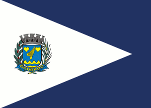A dark blue flag, with the municipal arms on a white triangle extending almost all across the flag from the hoist.