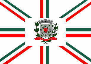 A white flag, with a union jack-like arrangement of upright and diagonal crosses, coloured green-white-red and the municipal arms on a rectangle in the centre.
