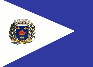 A blue flag with a white triangle extending from the hoist about 75% of the length of the flag, bearing the municipal arms.