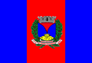 A vertical triband, blue-red-blue, with the municipal arms in the centre.