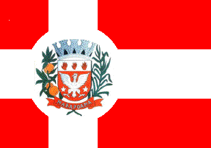 The flag of Marapoama is red with a white, off-centered cross. Over the intersection of the cross' arms is placed a white disk charged with the municipal coat of arms.
